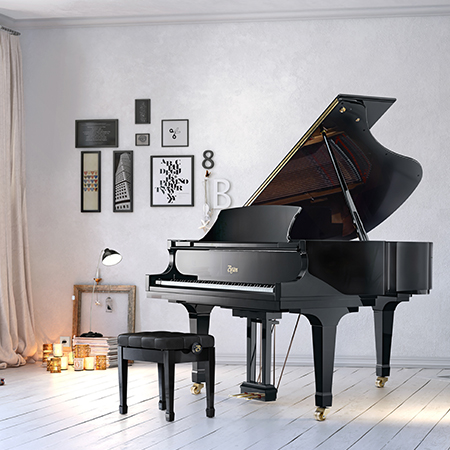 - Резонансна дека: З суцільної, не ламінованої високогірної ялини (мінімум 3 річних кільця на см), опуклої форми, перепад товщини від 8 мм до 6 мм в басовій секції для кращої вібрації (конструктивне рішення компанії Steinway & Sons від 1936 р.) Площа вібрації 1.3 м².